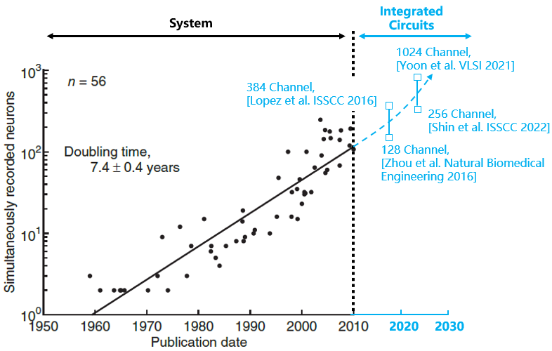 侵入式脑机接口芯片的主要优势在于可以在保证数据采集和传输等质量的前提下,降低脑机接口系统的功耗和尺寸,并提高系统可采集的神经通道数量。最近几年发表的脑机接口芯片单个通道的功耗已经在1-10uW之间,每个通道的面积已经在0.005mm2-0.02mm2之间。根据自然杂志的研究报道[6],脑机接口呈现出类似于“摩尔定律”的发展规律,每隔7至7.5年,脑机接口所能够直接采样的通道数量翻倍,如图8-3所示。以近年的研究成果为例,欧洲的Neuralpixel已实现了超过300通道神经信号采集的脑机接口芯片[7],而美国的Neuralink公司更是将采集通道数量提升至1024[8]。