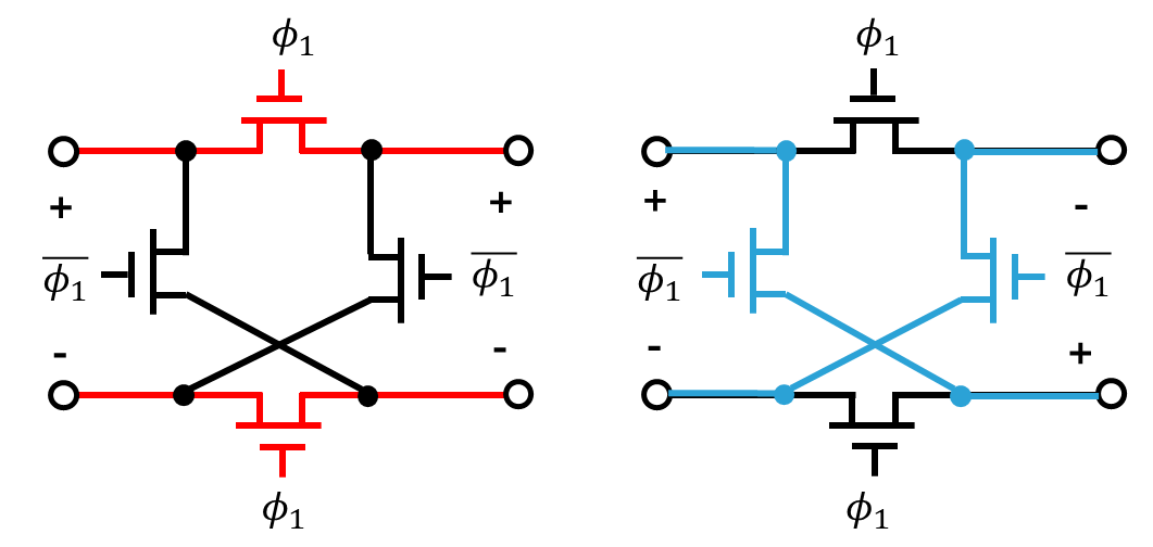 图8-10所示为最简单的斩波器设计,通过对反向开关\(\phi_{1}\)\(\overline{\phi_{1}}\)的控制,实现了信号的极性反转,该操作相当于对原始信号乘以+1和-1,等效于在时域实现两个信号的乘积。