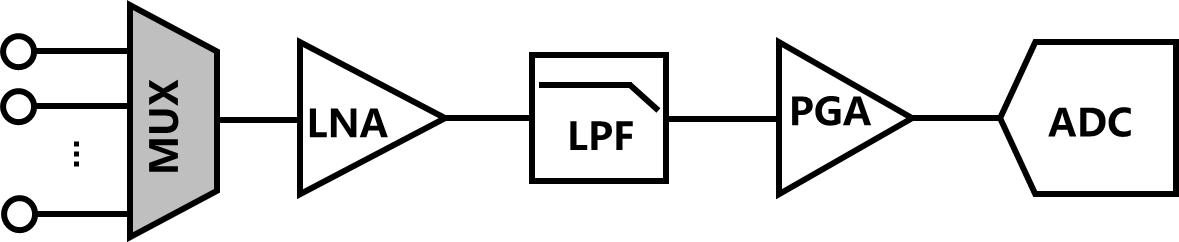 为了实现更加高通量的神经信号记录,近年来图8-15(b)所示的快速时分复用技术逐渐受到更多的关注[31-34]。该电路通过前置的模拟多路选择器实现对模拟前端放大电路的时分复用。虽然该电路结构通过减少放大器和ADC的数量以降低芯片面积,但是每个通道都有其自己独立的、随时间变化的等效输入直流失调。除此之外,噪声混叠也是一个具有挑战的问题。