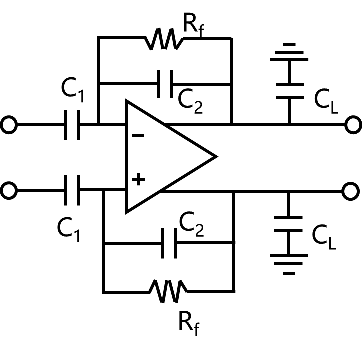 图8-5展示了通过电容耦合方式实现高通滤波的经典电路[11],其中反馈环路中伪电阻Rf和电容C2共同引入了截止频率为1/(2πRfC2)的高通极点,而中频增益则为电容C1和C2之比。尽管该电路在植入式脑机接口芯片中广泛采用,但是其在使用过程中存在芯片面积较大的问题。例如,为了将截止频率降低至1Hz以下且实现较高增益,即使将C2电容的大小选择为约200fF的最小电容,C1电容的大小仍需在10pF以上。这样会占用较大的芯片面积,限制了芯片的集成度和扩展性。此外,该电路所用的伪电阻阻值对工艺敏感,不易精确控制,这会影响放大器截止频率。