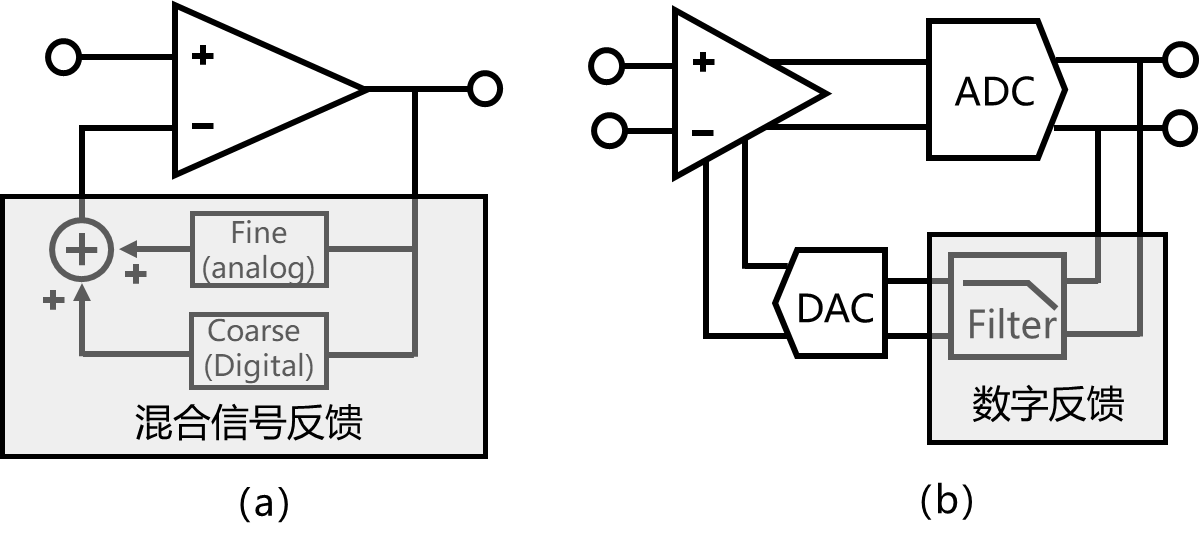 近年来,基于数字直流伺服环路的方式被广泛应用于直流失调抑制[15]。图8-8(a)的电路设计利用反馈中的数字低通滤波器来降低功耗,并使用附加的模拟低通滤波器来降低经过数字路径的直流信号的动态范围,从而放宽DAC分辨率的要求。图8-8(b)利用数字电路实现低通滤波,消除了大电容或者放大器的使用,有效的降低了面积和功耗,且可实现较为精确的极点控制。利用数字反馈的典型直流失调抑制范围约在±50mV左右。