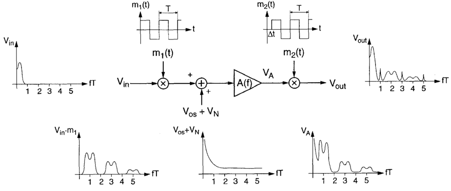 斩波技术的主要原理是利用周期性方波的交流调制信号,将失调电压以及闪烁噪声等低频信号调制至高频,然后通过低通滤波器来消除这些噪声。其具体工作原理如图8-9所示[16]。输入为Vin的脑电信号在方波信号m1(t)控制的开关切换下完成两个信号在时域内的相乘。由于方波信号本身的频率特性,输入信号将被调制到斩波频率的奇次谐波频率处。经过本次调制后,神经信号、直流失调、低频噪声以及热噪声都将被放大器A放大。输出信号VA即为神经信号和噪声的简单叠加和倍增。VA信号再次在m1(t)控制的开关切换下完成两个信号在时域内的相乘。此时,闪烁和低频噪声如同Vin第一次被调制一样,被调制到了斩波频率的奇次谐波频率处。然而输入信号Vin由于经历了两次调制,其基频处作为二次谐波信号强度最高,最后通过滤波器将高于带宽的干扰信号和谐波分量进行滤波即可获得经过放大的神经信号。